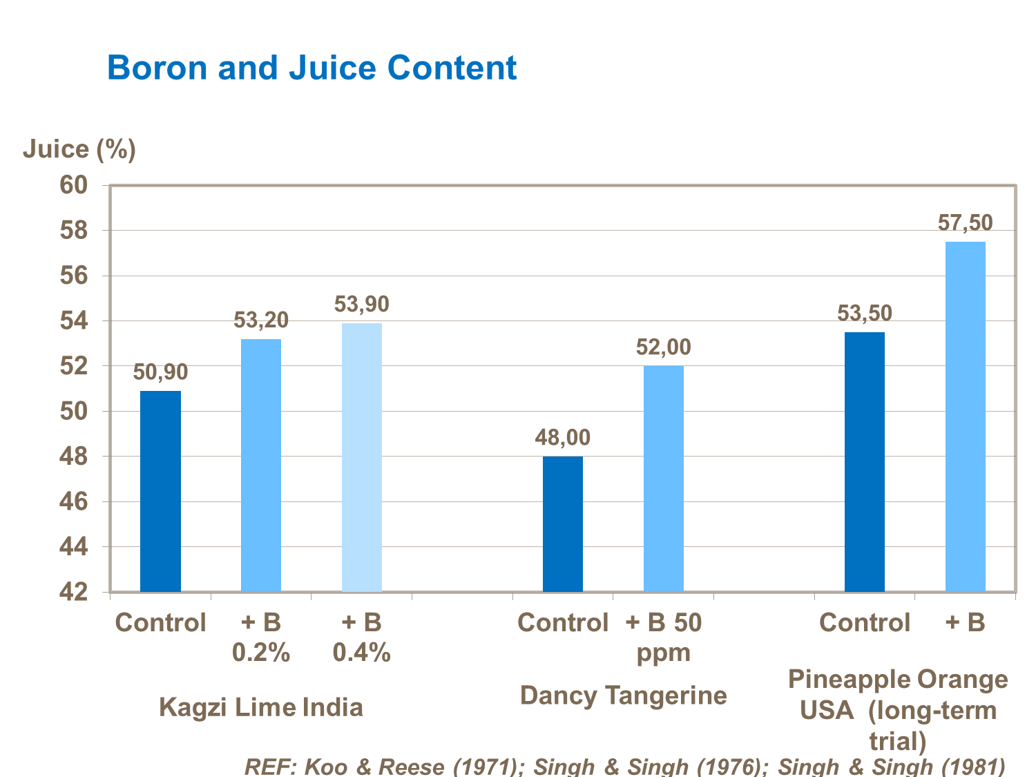 Les apports de phosphore, de magnésium et de bore tout au long du développement des fruits améliorent leur teneur en jus. Ces éléments doivent néanmoins faire partie d'un programme de nutrition équilibré pour garantir les meilleurs résultats possibles.