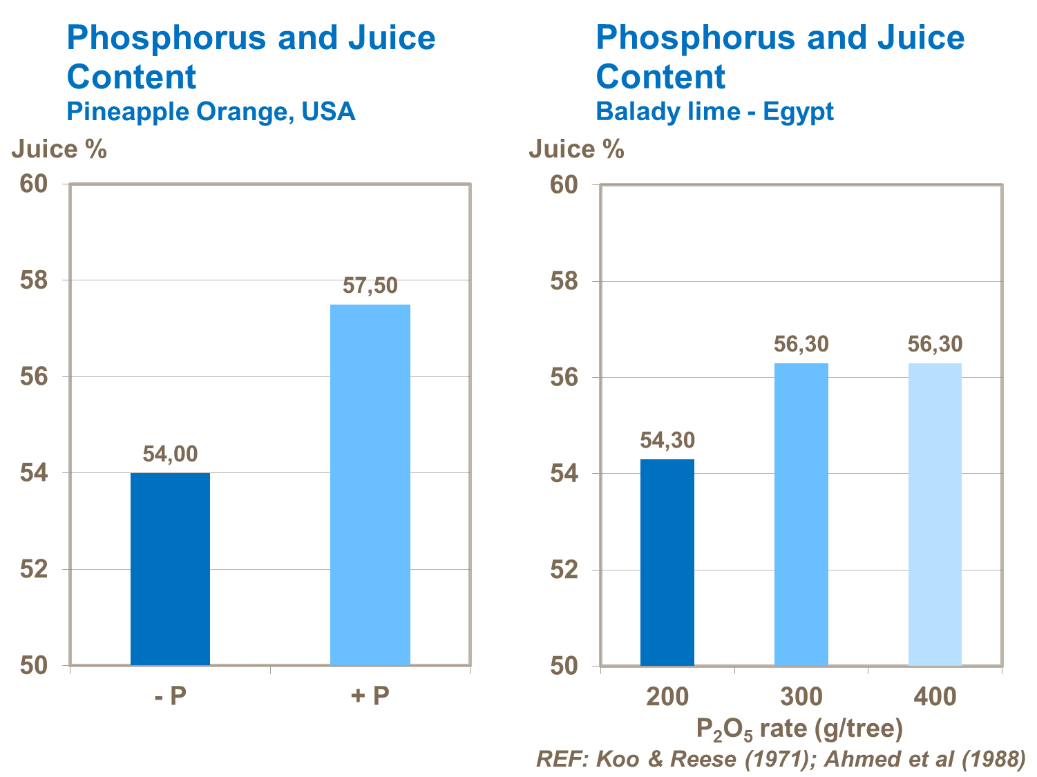 Le phosphore a un effet positif sur la teneur en jus des fruits. Ces essais soulignent son rôle chez les limes Balady et les oranges Pineapple.