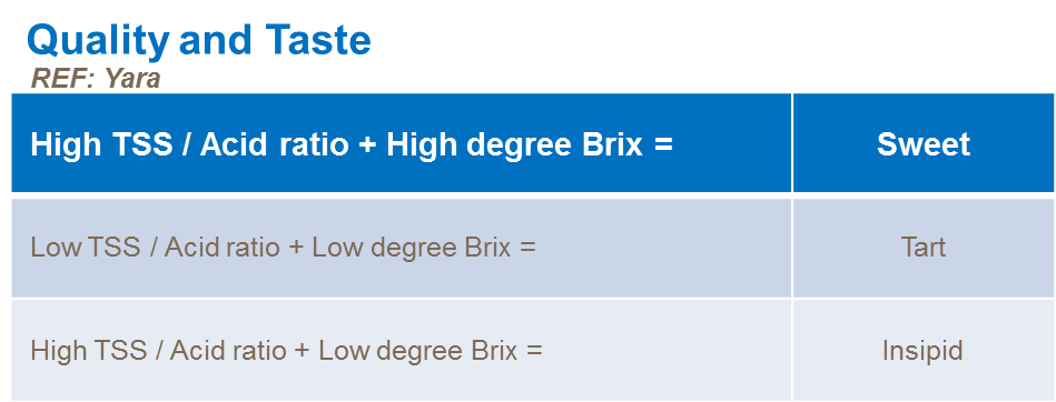 La saveur et le goût dépendent du niveau de sucres solubles totaux (SST), de l'acidité et des tendances aromatiques ou amères contenues dans le fruit. La teneur en SST du fruit est généralement mesurée en degrés Brix.