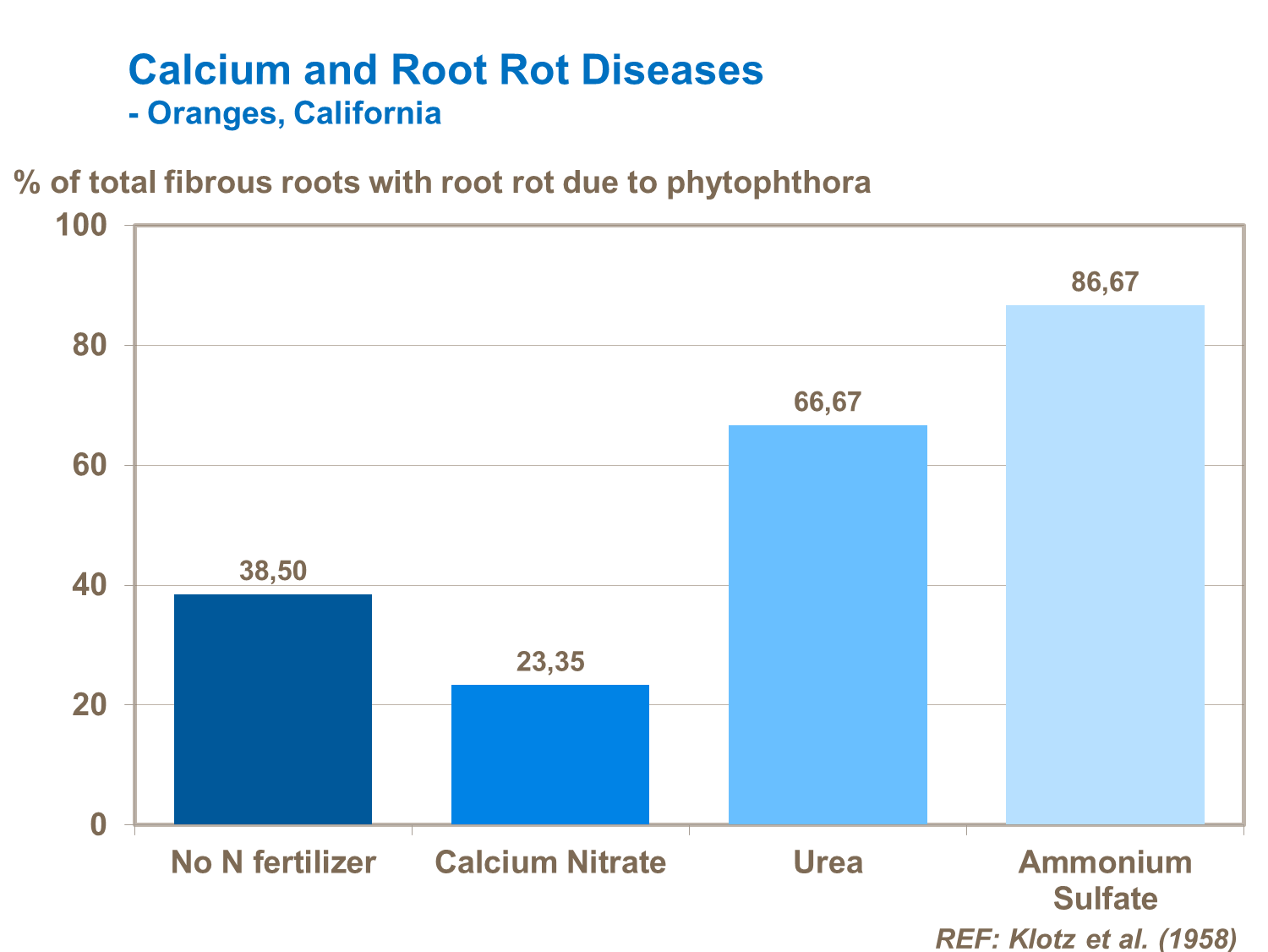 Les arbres bénéficiant un programme d'applications comprenant du nitrate de calcium présentent une faible incidence de pourriture racinaire (Phytophthora) en comparaison de ceux traités au sulfate d'ammonium et à l'urée. Des essais réalisés avec l'engrais YaraLiva à base de nitrate de calcium confirment ces résultats.