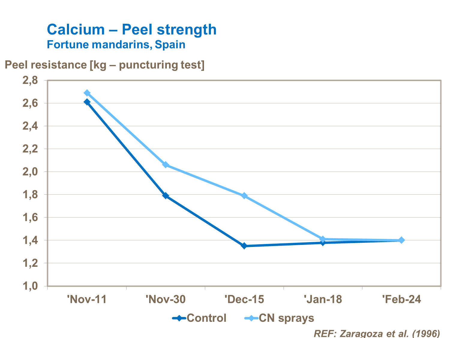 The role of calcium in improving skin cell wall strength has been confirmed in Spanish trials. Treated mandarins had greater fruit firmness during ripening on the tree, making them less susceptible to puncturing during harvest, transport and storage. In this trial, this improvement lasted at least 2 months.