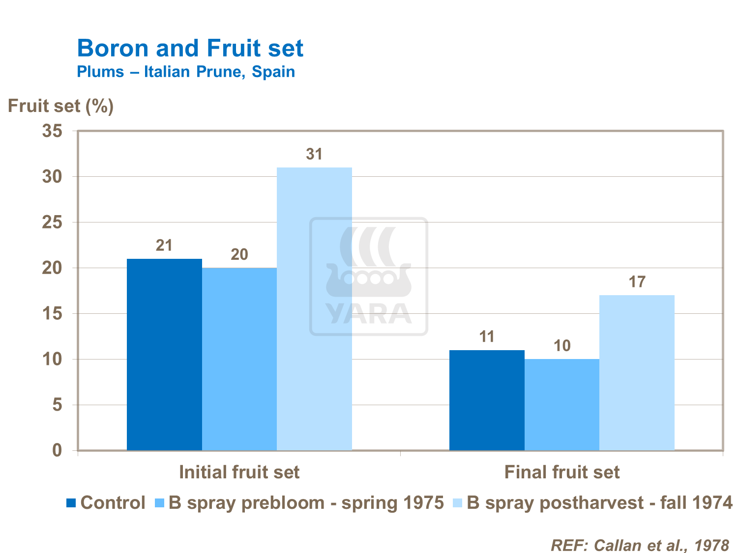 À l'image du bore, un mauvais apport en zinc entraîne l'avortement des fleurs et la perte de fruits. Les pulvérisations au début du printemps lorsque les feuilles sont encore en phase d'expansion se révèlent les plus efficaces pour atteindre les taux de zinc supérieurs souhaités dans les feuilles.